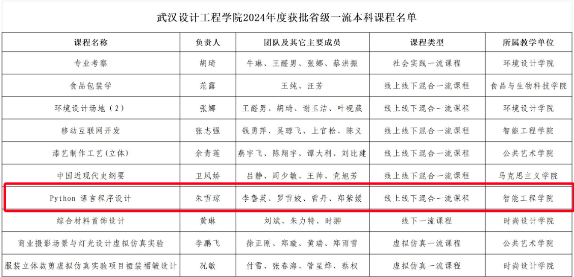 (通讯员:朱雪琼)近日,《省教育厅发布省教育厅关于公布2024年度省级一流课程认定结果的通知》(鄂教高函〔2024〕25号)正式公布2024年度省级一流本科课程认定结果,公司的《Python语言程序设计》课程获批省级一流本科课程。