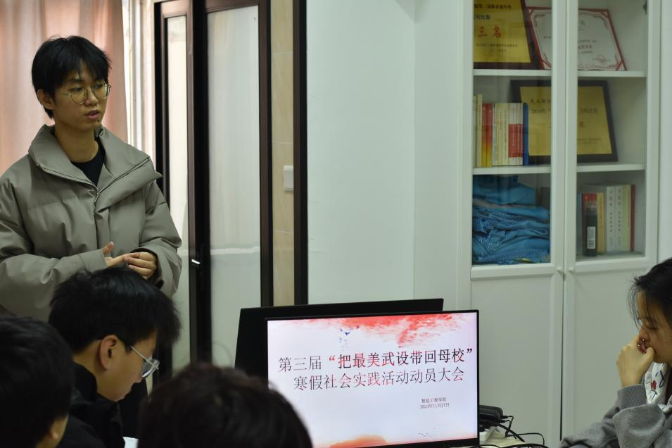 11月27日中午12:00,为更好迎接第三届“把最美武设带回母校”寒假社会实践活动,谈球吧于春半斋“AI心苑”员工社区开展了寒假社会实践活动经验分享讲座。本次分享会由辅导员王卫玲主持。