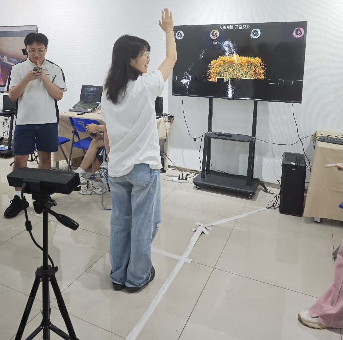 数字媒体技术专业何丹琪作品《四季・生花》基于Kinect设备与Touch designer技术,通过识别人体动作呈现四季花卉粒子特效,将科技的精确与艺术的浪漫融为一体,为观众带来一场视觉与科技交织的盛宴。