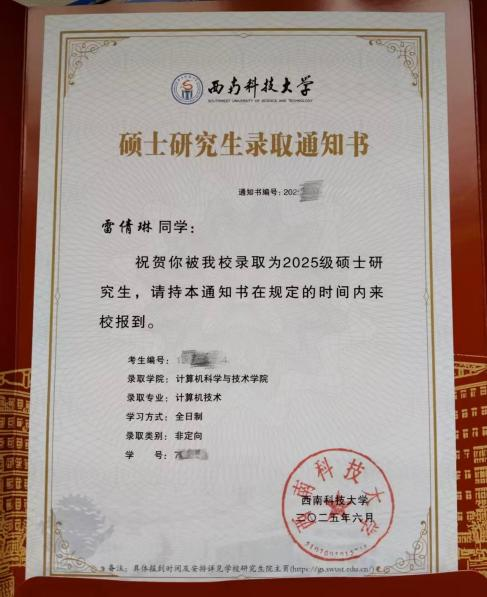 在逐梦考研的征程中,雷倩琳同学以坚定的信念、科学的方法,成功录取西南科技大学计算机技术专业硕士硕士研究生。她的备考故事,藏着突破迷茫、高效奋进的密码,让我们一同汲取这份珍贵的考研力量。
