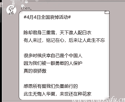 对此,公司学子也自发组织在各个班群里开展了“深切悼念新冠肺炎疫情牺牲烈士和逝世同胞”为主题的主题班会,部分学子也发出了来自内心深处的感悟: