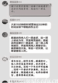 王嘉璇:今天,我们怀着无比沉痛的心情,开展这一次线上班会,2020年4.4日,是一个送别我们逝世同胞,送别英勇抗疫烈士的日子,在这个日子,我们每个人都怀着无比沉痛的心情,但是,我也希望,借着今天,让我们明白,今天的日子是多么来之不易,我们之所以平安生活,是因为有人替我们负重前行!