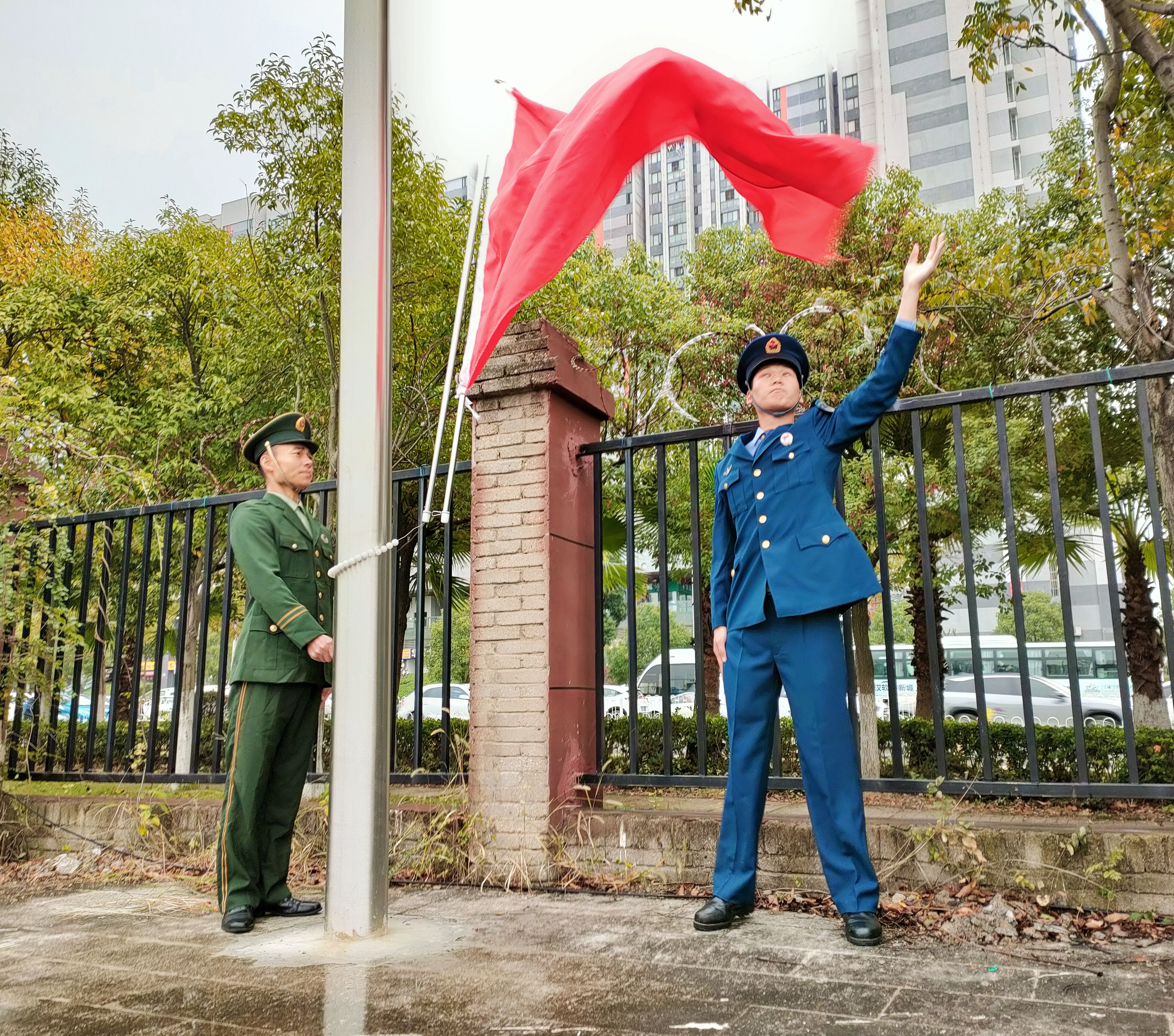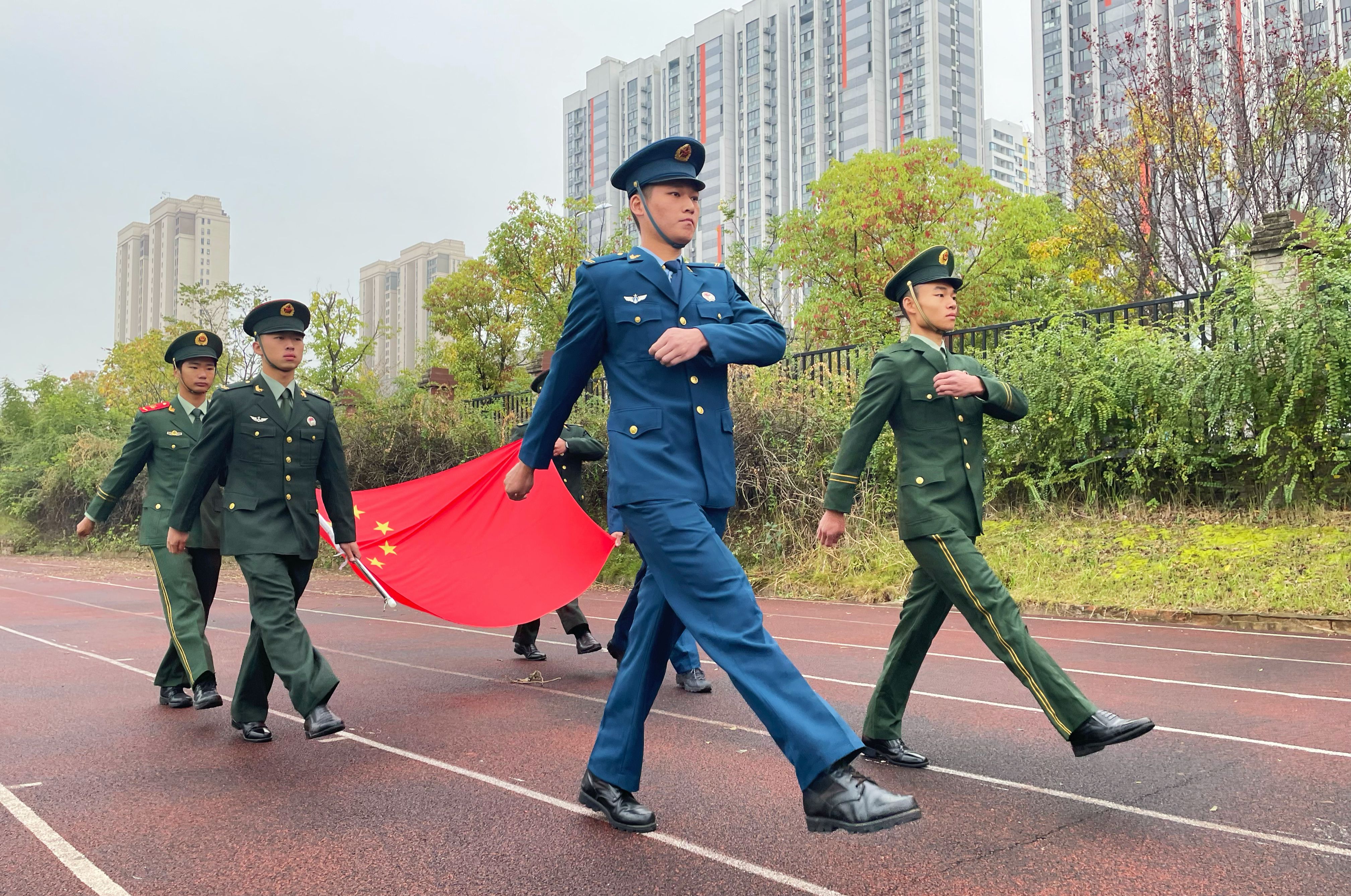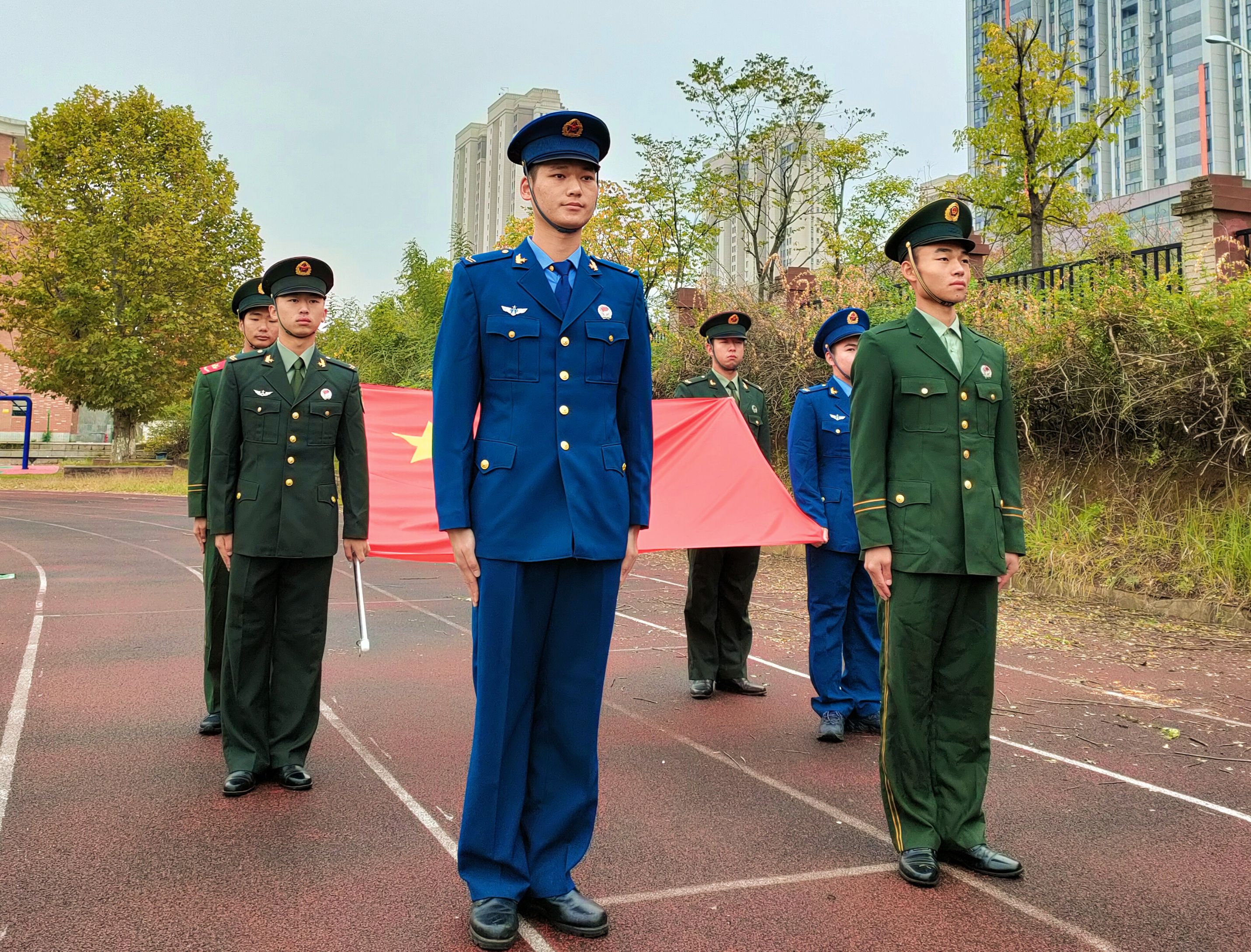 六名旗手都是公司员工中的退伍军人,他们分别来自空军退伍士兵徐睿、龙宇力,陆军退伍士兵严安、高晟恒,武警退伍士兵肖乐、陈明志。他们的每一次迈步,每一声口号,都展示着退伍士兵的自律自强,展示着武设学子的精神面貌,更展示着国旗的耀眼光辉。