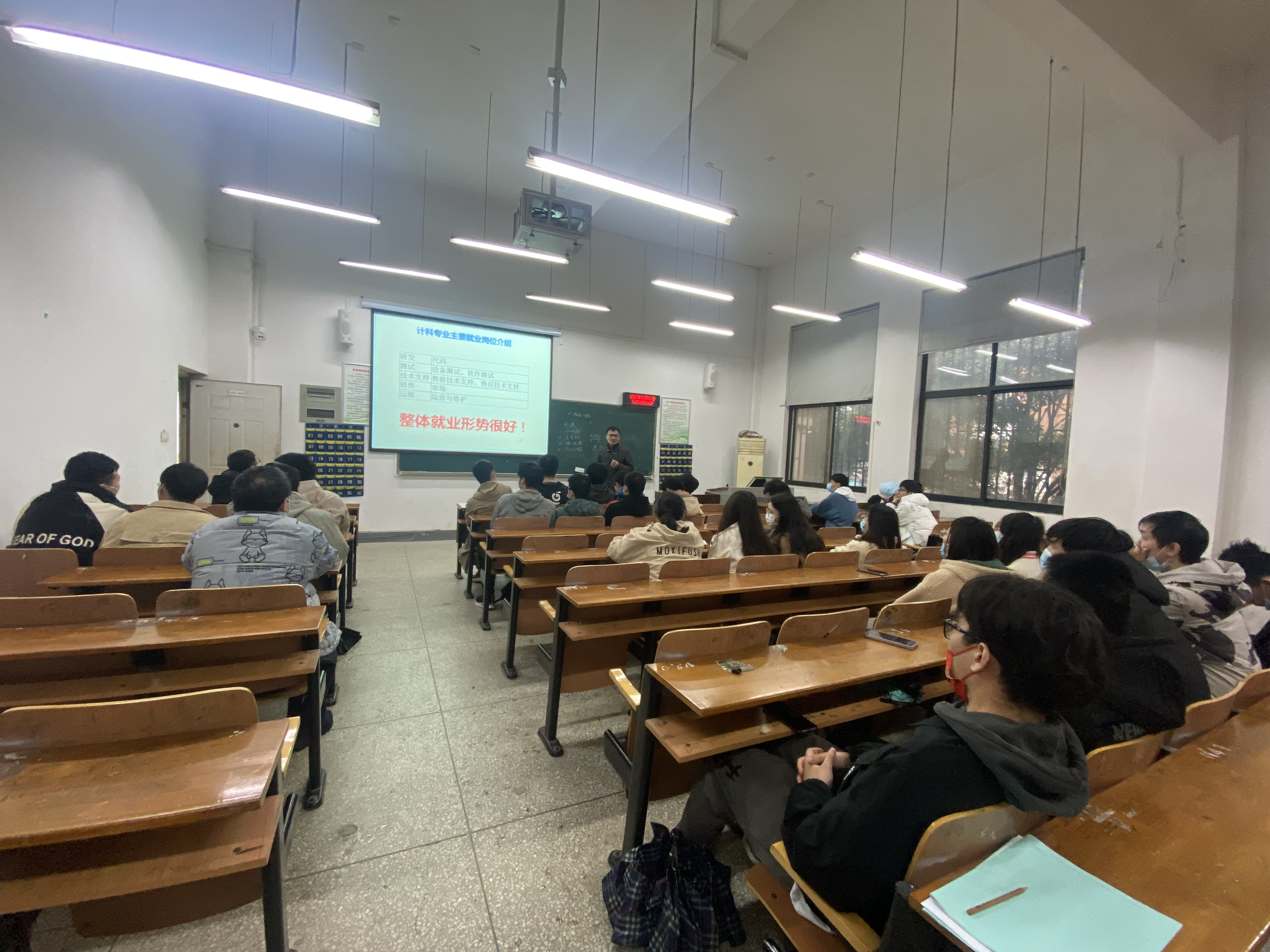 杜健老师则分享了自己的学习和工作经历,对前两位专业老师的讲话进行了总结并发表了自己的看法。杜健老师表示对于是否应该在毕业前夕进行培训班学习,取决于自己大学四年的表现;对优先选择进大公司还是小公司也发表了自己独到的见解,大公司和小公司主要表现在深度和广度的区别,大公司的工作做得更深,而小公司负责的项目内容更多,专业知识面更广,两者各有优势,但大公司名气大,更利于以后的职业发展;最后对于员工应聘中应该注意的细节也做了一些讲解。